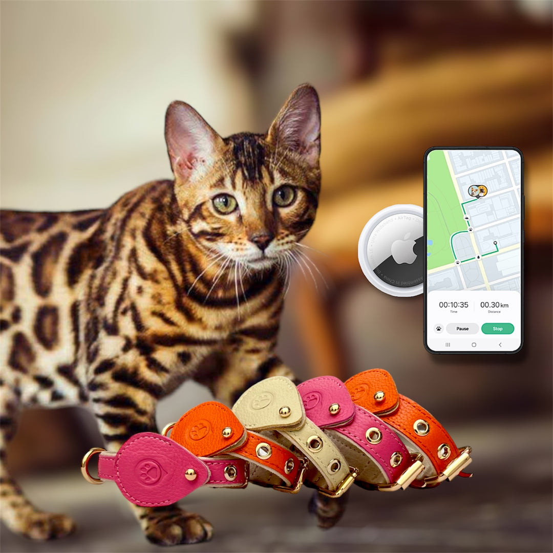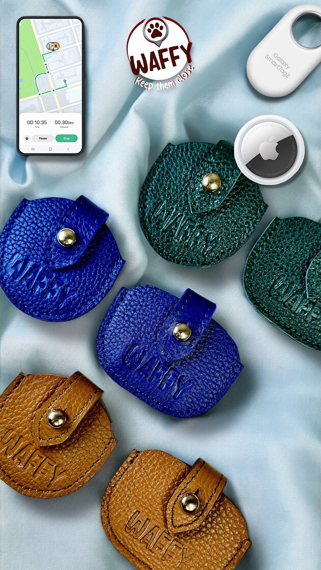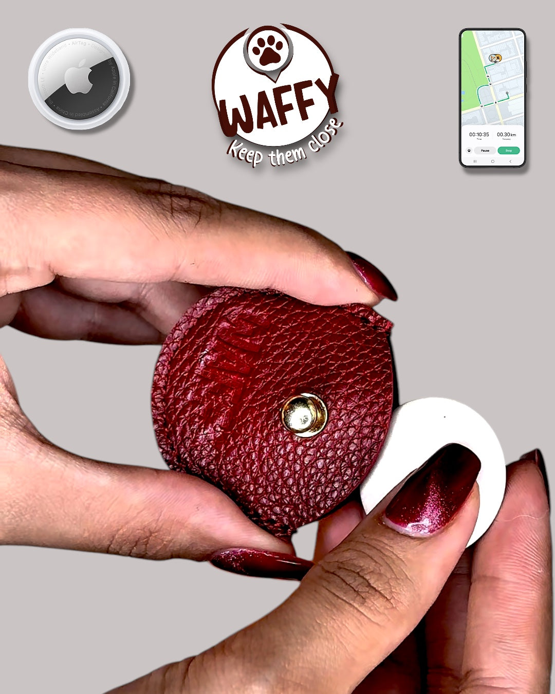 🔍 Il vous faut un AirTag Apple, à insérer dans un étui en cuir Waffy ou un collier en cuir Waffy compatible.